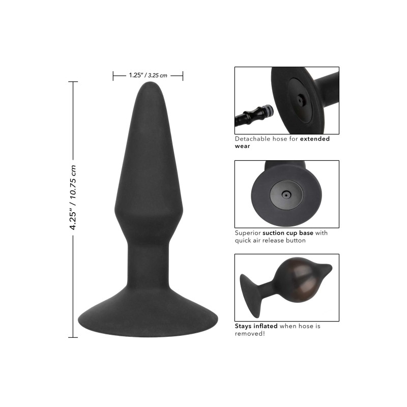 Il tappo gonfiabile in silicone grande CalExotics è una sonda anale unica nel suo genere con corpo gonfiabile, bulbo di facile compressione e tubo staccabile. La sonda incredibilmente elettrizzante rimane gonfia anche quando il tubo è staccato! Per gonfiare la tua estasi, collega semplicemente il tubo e premi il bulbo di facile compressione. Una volta raggiunta la dimensione desiderata, la sonda manterrà le sue dimensioni anche quando il tubo viene rimosso e il pulsante di rilascio rapido dell'aria consente una leggera sgonfiaggio e rimozione. Godersi il mondo esilarante del piacere anale al massimo, l'inserimento facile e la stimolazione sensuale è la chiave del successo.