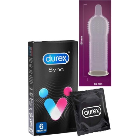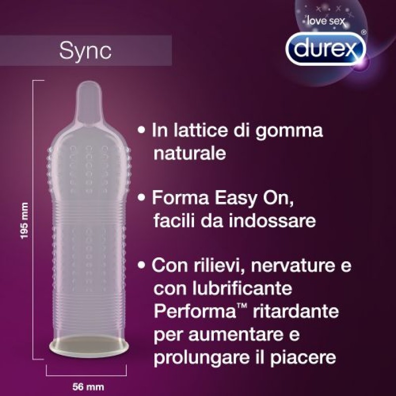 Dall'innovazione Durex, un nuovo prodotto per rivoluzionare il concetto del piacere. Con un mix incontrastato di ricerca, innovazione e qualità, Durex interpreta le esigenze del mercato e le traduce in risposte ideali per soddisfare i desideri dei consumatori alla ricerca di un completo benessere sessuale. Noi lo sappaiamo...donne e uomini sono differenti, raggiungono l'orgasmo in tempi diversi. Grazie a Sync, il piacere della coppia ha lo stesso fuso orario.