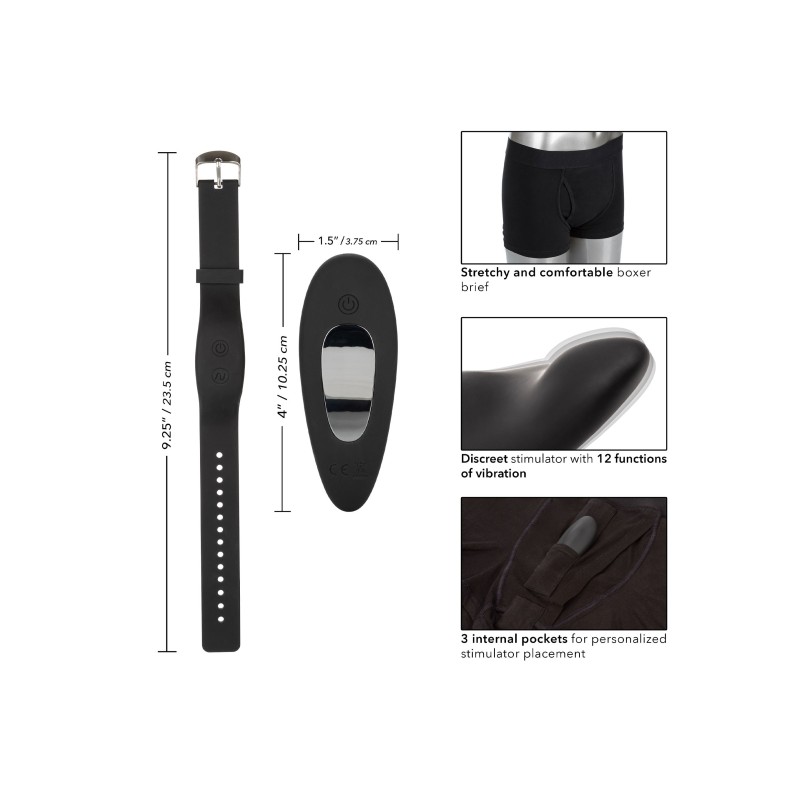 Il Boxer Brief Set con telecomando è fatto per avventurosi cercatori di piacere, con un boxer extra comodo abbinato a un potente mini vibratore e un discreto controller da polso. L'elegante, ma discreto controller del braccialetto rende facile per te o il tuo amante controllare l'intensità della vibrazione con il semplice tocco di un pulsante. Ogni volta che o ovunque ti porti la passione, il raggio di 32 piedi di questo appassionato mini vibratore e 12 intense funzioni di vibrazione sono pronte per il gioco. I boxer discreti e aderenti hanno 3 tasche interne per stimolatori per un posizionamento personalizzato dello stimolatore.