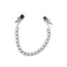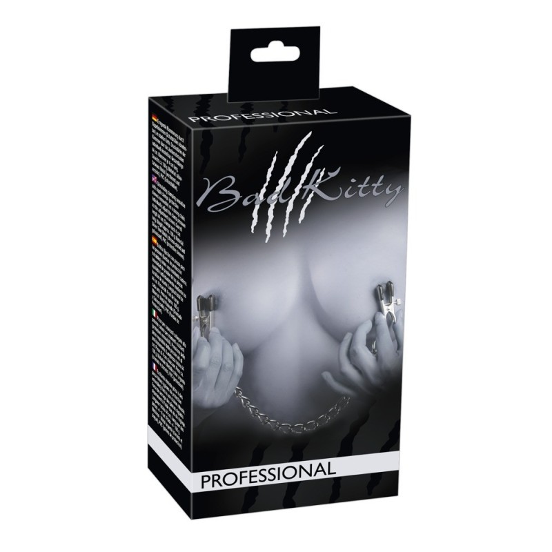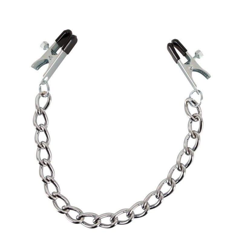Morsetti per capezzoli (coperture protettive rimovibili) su una catena resistente. La pressione dei morsetti può essere regolata individualmente mediante le viti di regolazione. Lunghezza totale 43,5 cm. Morsetti lunghi 2,3 cm ciascuno. Peso circa 100 g. Materiale: metallo color argento (cromato e zincato), PVC (coperture protettive).