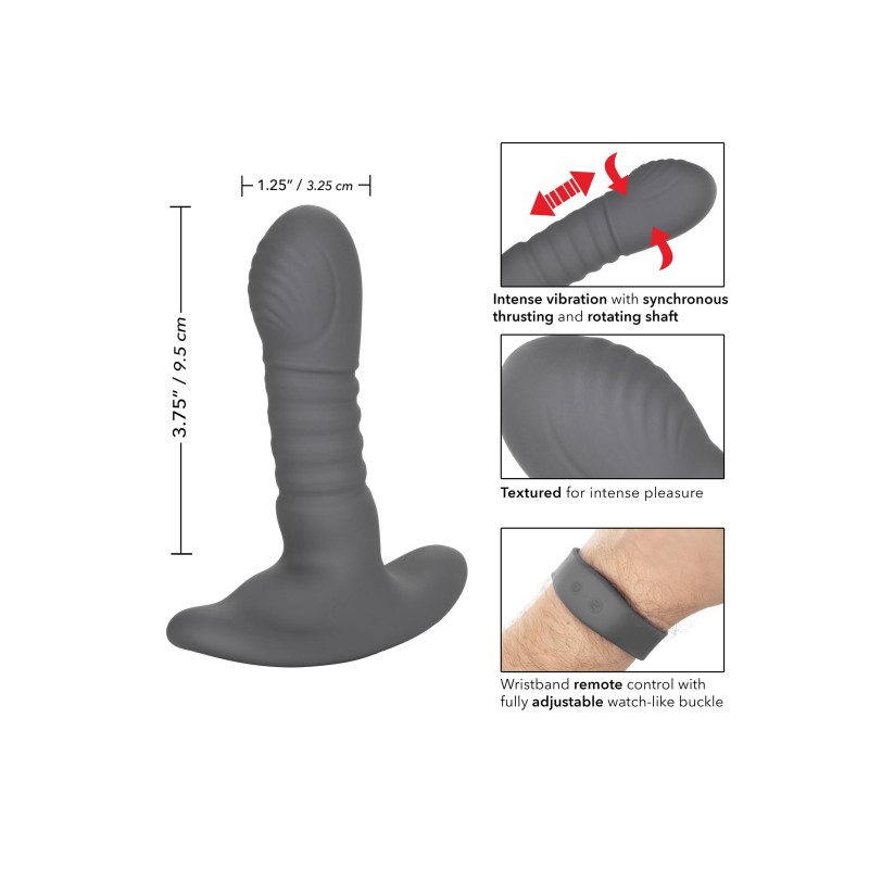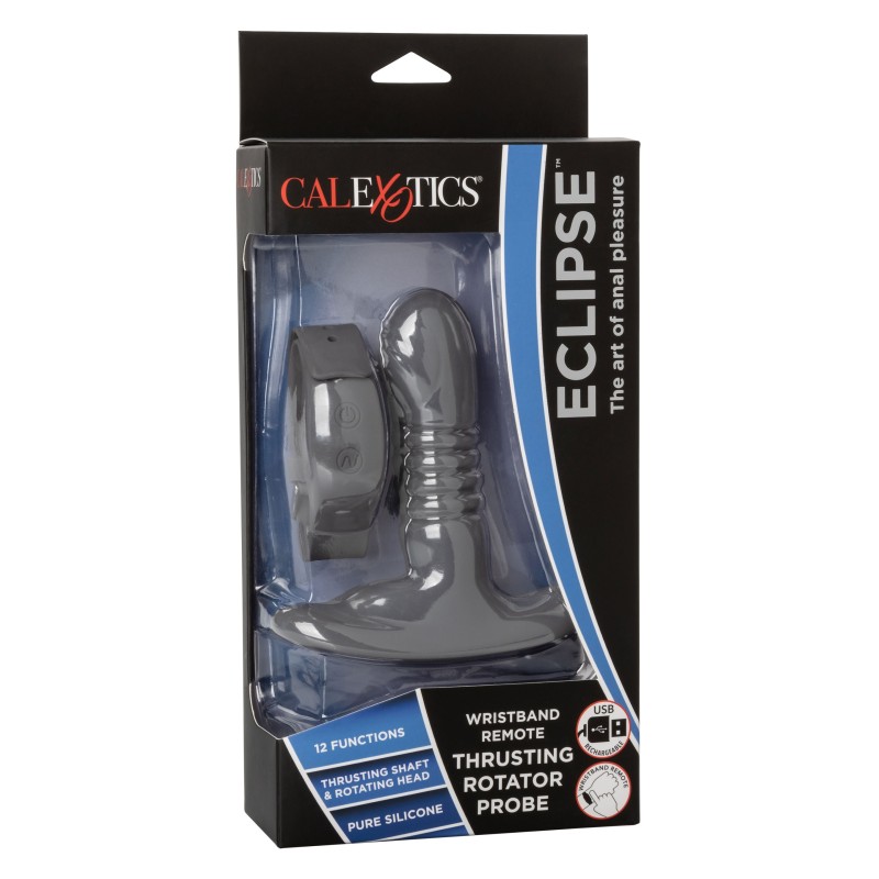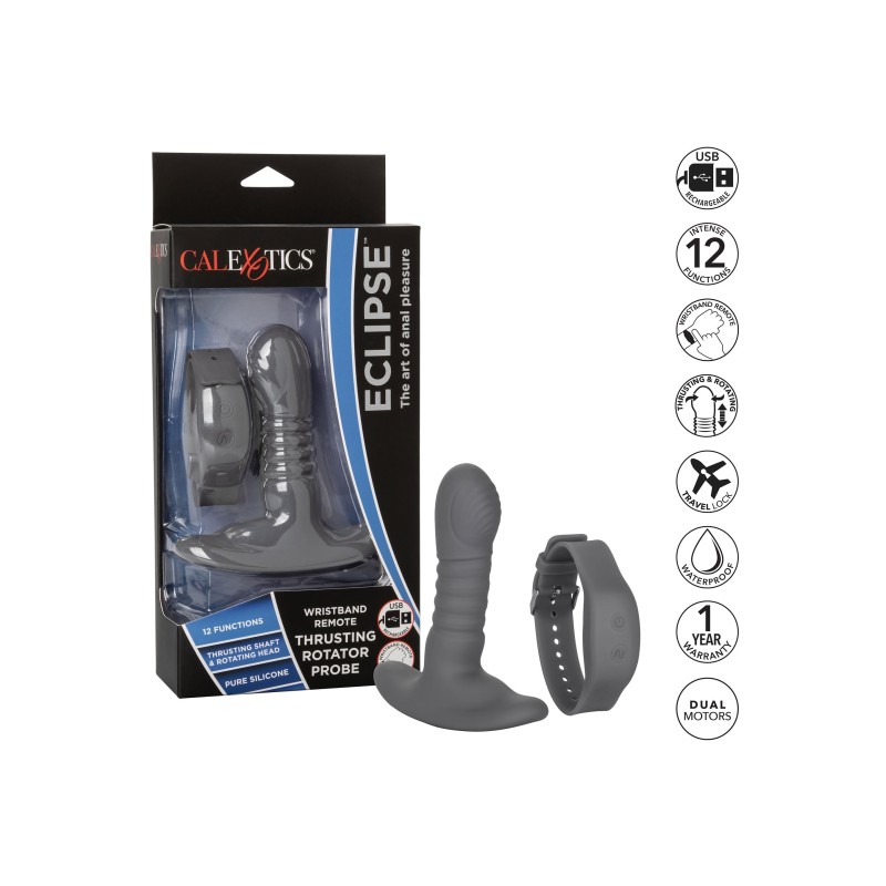 La sonda rotante a spinta remota del braccialetto Eclipse ™ è una sensuale sonda in silicone creata per farti provare un piacere anale elettrizzante. L'elegante telecomando del braccialetto controlla 12 potenti funzioni di vibrazione con intense azioni di rotazione e spinta sincronizzate e due potenti motori. Ogni volta o dove ti porta la passione, il raggio di 32 piedi di questo vibratore appassionato e 12 intense funzioni di stimolazione intensa sono pronte per il tempo di gioco.Scegli l'intensità del tuo piacere e cavalca le onde della stimolazione interna orgasmica con rotazione sincronizzata, vibrazioni e azioni di spinta. L'albero sensualmente curvo, la base sagomata e il controllo facile da premere ti consentono di immergerti in profondità nella stimolazione senza sforzo. Due potenti motori di vibrazione nell'albero e nella base forniscono una rumorosa stimolazione backdoor, mentre il corpo sagomato si flette e si muove con te durante i tuoi momenti più X-rated. Goditi un inserimento confortevole, una stimolazione senza sforzo e una rimozione delicata con la forma ergonomica delicata, il design flessibile e la base curva Ricarica il massaggiatore in silicone premium in 90 minuti con il cavo di ricarica USB in dotazione per goderti 45 minuti di stimolazione ad alta velocità o 60 minuti a bassa velocità vibrazioni. Mentre il pulsante Easy controlla l'intensità e la sonda paffuta ti dà la stimolazione che desideri, il chip di memoria all'avanguardia integrato ricorda esattamente come ti piace iniziando dall'ultima funzione utilizzata.