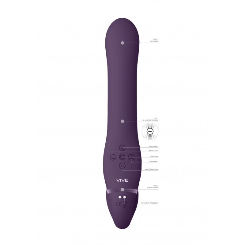 Lo strap-on strapless VIVE047 per punto-G con tecnologia a onde d'aria sicuramente offre il meglio su entrambe le estremità. Tre motori di Nuova Generazione F1 a 10 velocità/funzioni di nuova generazione controllati in modo indipendente alimentano questo vibratore dal design accattivante. Il giocattolo contiene un motore con punta di vibrazione del punto G, un motore di vibrazione interno e un motore pulsante a onde d'aria stimolante il clitoride con un tickler. Con oltre 1.000 diverse combinazioni, questo giocattolo ti porterà in luoghi mai immaginati. Quando ti avvicinerai all'orgasmo, un solo tocco del pulsante della funzione speciale orgasmo porterà immediatamente tutti i motori alla massima potenza/velocità. Il vibratore in silicone di grado medicale completamente ricaricabile tramite USB magnetico, vanta una durata della batteria di 45 minuti ed è totalmente impermeabile(IPX7) e ciò significa che puoi goderti questo giocattolo ovunque tu voglia. Tutti i vibratori VIVE hanno 1 anno di garanzia.