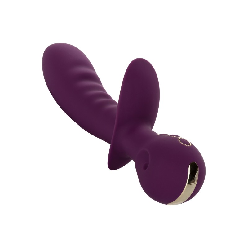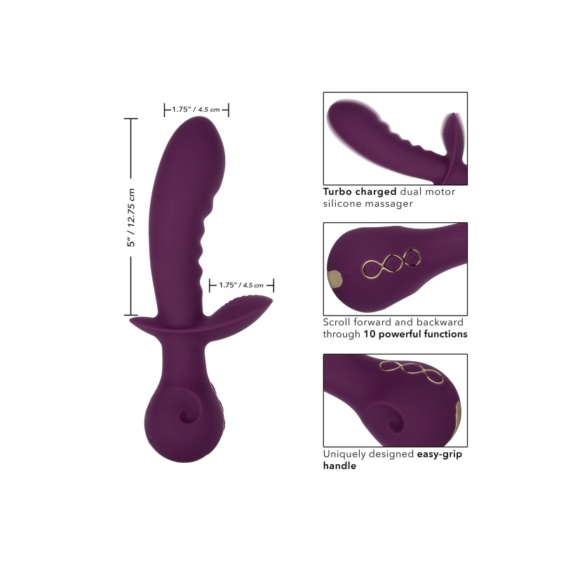 Stimola le ginocchia con i potenti motori doppi. Assecondate il piacere personalizzato, scegliendo tra le 10 potenti funzioni di vibrazione. Due potenti motori, uno nel fusto e l'altro nel teaser, producono vibrazioni rimbombanti da quasi tutte le angolazioni. Scorrete avanti e indietro tra le varie opzioni orgasmiche con i facili comandi a due pulsanti. Il massaggiatore è realizzato in un silicone igienicamente superiore e rifinito con decorazioni di design.
