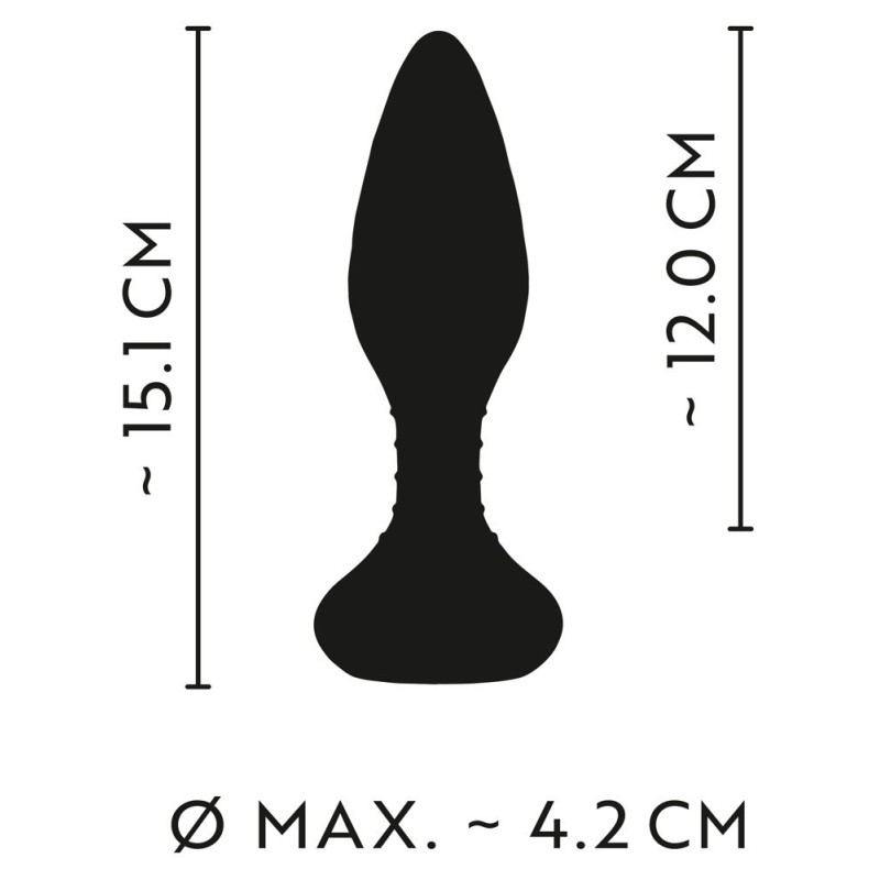 Lunghezza totale 15,1 cm, lunghezza d'inserimento 12 cm; Ø max. 4,2 cm, cono Ø 2 cm. Peso 199 g. Silicone, PU, ABS.