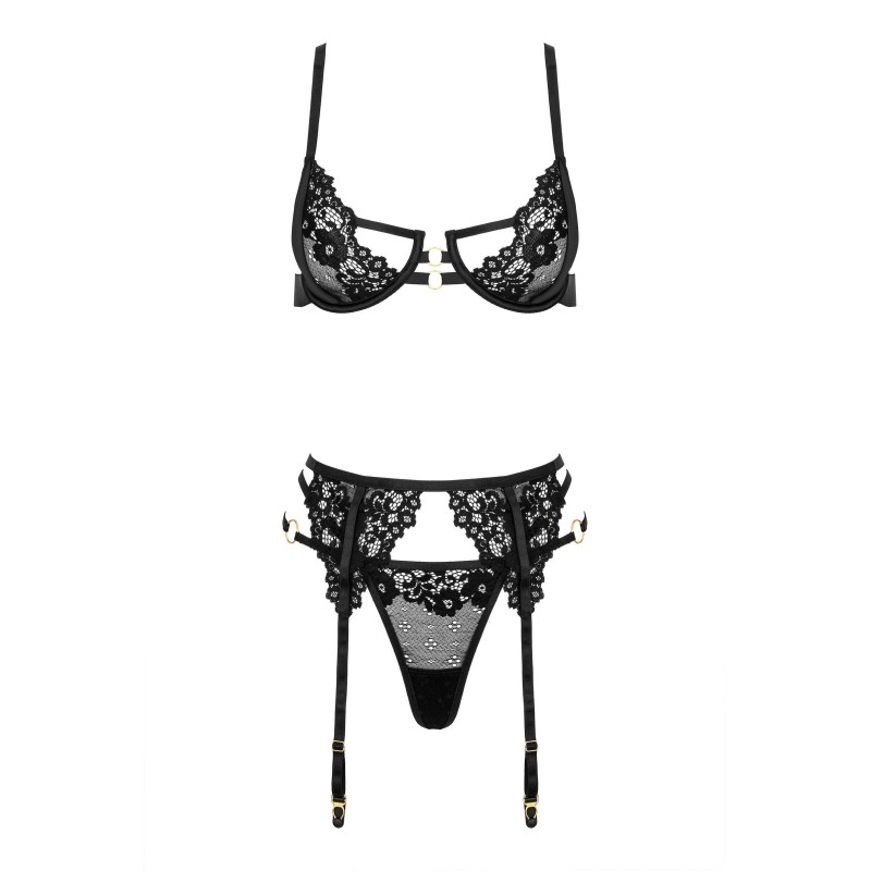Questo affascinante e seducente set combina il meglio del design classico e moderno, emanando un look incredibilmente lussuoso. Realizzato in pizzo di alta qualità e in elegante raso, il set emana eleganza e raffinatezza. Il reggiseno si chiude sulla schiena con un gancetto che garantisce stabilità e comfort. Le spalline regolabili assicurano una vestibilità perfetta e il massimo comfort. I ferretti sollevano il seno e accentuano il décolleté in modo lusinghiero. Il pizzo è progettato per offrire scorci sottili pur garantendo un ottimo sostegno. Il reggicalze regolabile allegato consente di fissare le calze come si desidera. Il perizoma coordinato completa perfettamente il set. Si prega di notare che le calze non sono incluse