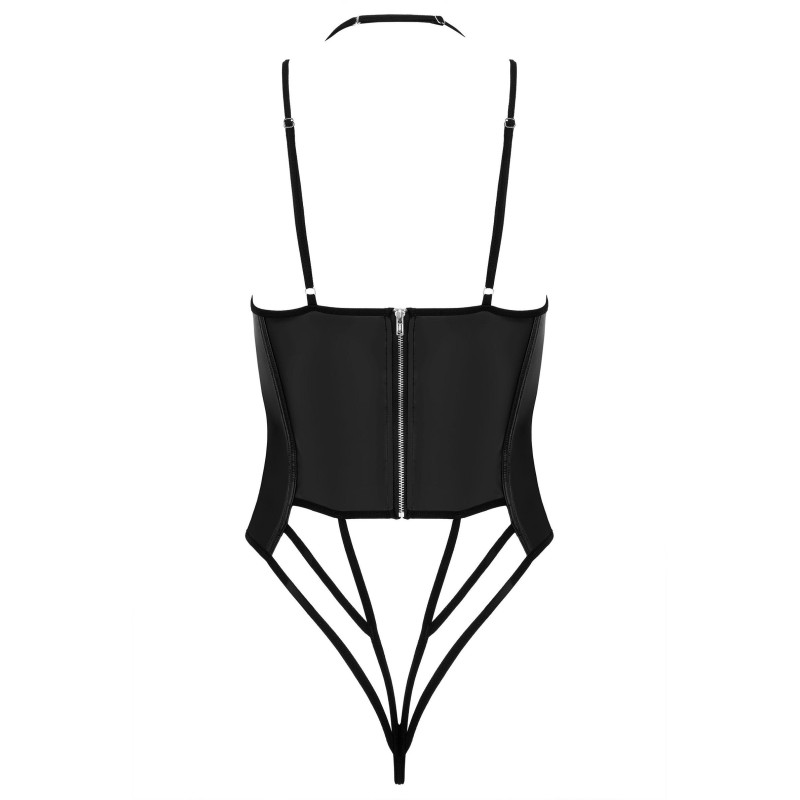 Questo body off-shoulder mozzafiato presenta un design straordinario realizzato con materiali di alta qualità simili alla pelle. Il taglio raffinato accentua perfettamente la vostra femminilità, mentre le coppe con ferretto offrono un sostegno ottimale. Le spalline regolabili assicurano il massimo comfort e una vestibilità impeccabile che abbraccia magnificamente il corpo. Una comoda cerniera sul retro facilita l'indossamento e la rimozione. L'elemento distintivo è il design unico sulla schiena, evidenziato da bande elastiche che aggiungono un tocco speciale. Il design a taglio alto allunga le gambe, completando il look elegante. Questo body è la scelta perfetta per le donne che desiderano combinare eleganza e seduzione in un capo di lingerie che mette in risalto le loro curve.