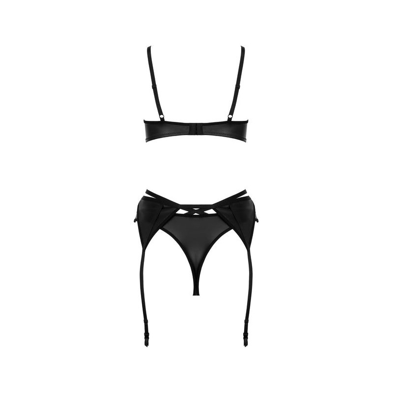 Questo splendido set di lingerie a 3 pezzi mette in risalto sensualità e femminilità, realizzato in un tessuto simile al lattice. Il reggiseno con ferretto offre un sostegno eccellente, accentuando la bellezza naturale del seno. Le coppe morbide si adattano perfettamente al corpo, garantendo una vestibilità confortevole. La parte posteriore del reggiseno presenta una chiusura regolabile a 3 ganci e le spalline sono regolabili individualmente. Il set comprende un sensuale reggicalze che sottolinea il punto vita e aggiunge eleganza al look complessivo. Anche le spalline della giarrettiera sono regolabili. Completa il set un elegante perizoma che rivela splendidamente i glutei. Questo set è ideale per le donne che desiderano rafforzare la loro sicurezza e il loro stile unico.