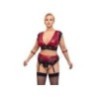 Bralette, perizoma con reggicalze ouvert e 2 polsini per le braccia in un set di Cottelli BONDAGE PLUS in un elegante look rosso opaco con fine pizzo nero elastico e dettagli in metallo color argento. La bralette scollata copre in modo seducente la parte superiore della schiena e le spalle. Il perizoma a vita alta è dotato di reggicalze cuciti strettamente e regolabili in lunghezza. Su ogni lato sono fissati degli anelli ai quali si possono agganciare i due polsini delle braccia con le loro catene a moschettone. Le cavigliere possono essere indossate rapidamente con le loro chiusure in velcro e regolate per adattarsi. Il cavallo del tanga è aperto.