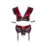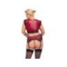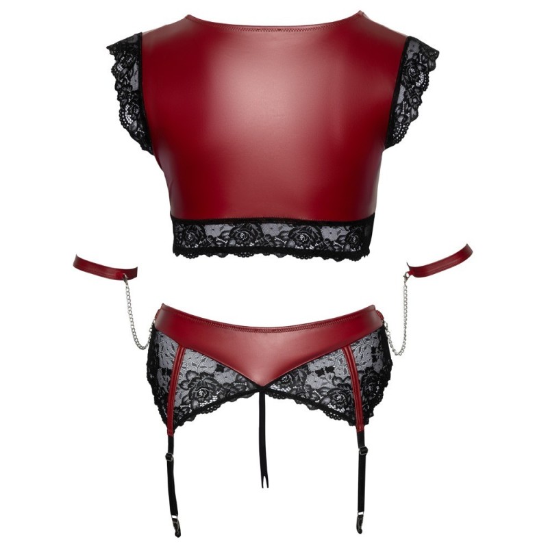 Bralette, perizoma con reggicalze ouvert e 2 polsini per le braccia in un set di Cottelli BONDAGE PLUS in un elegante look rosso opaco con fine pizzo nero elastico e dettagli in metallo color argento. La bralette scollata copre in modo seducente la parte superiore della schiena e le spalle. Il perizoma a vita alta è dotato di reggicalze cuciti strettamente e regolabili in lunghezza. Su ogni lato sono fissati degli anelli ai quali si possono agganciare i due polsini delle braccia con le loro catene a moschettone. Le cavigliere possono essere indossate rapidamente con le loro chiusure in velcro e regolate per adattarsi. Il cavallo del tanga è aperto.