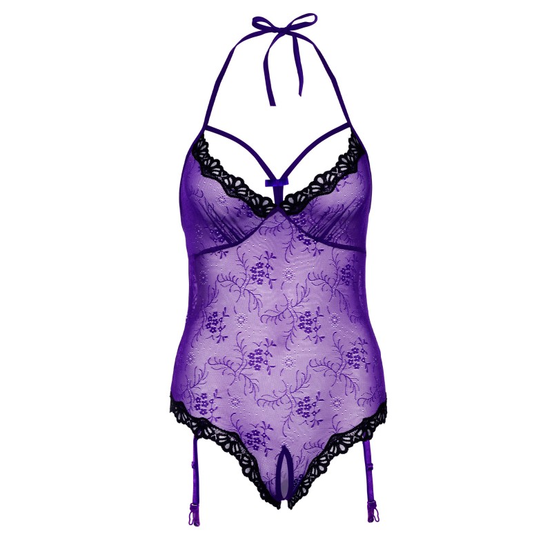 Teddy in pizzo con cavallo aperto - Body birichino con cavallo aperto con reggicalze regolabile. Delicato pizzo floreale, dettaglio di fiocco in raso e spalline elastiche per la cavezza per la migliore vestibilità.