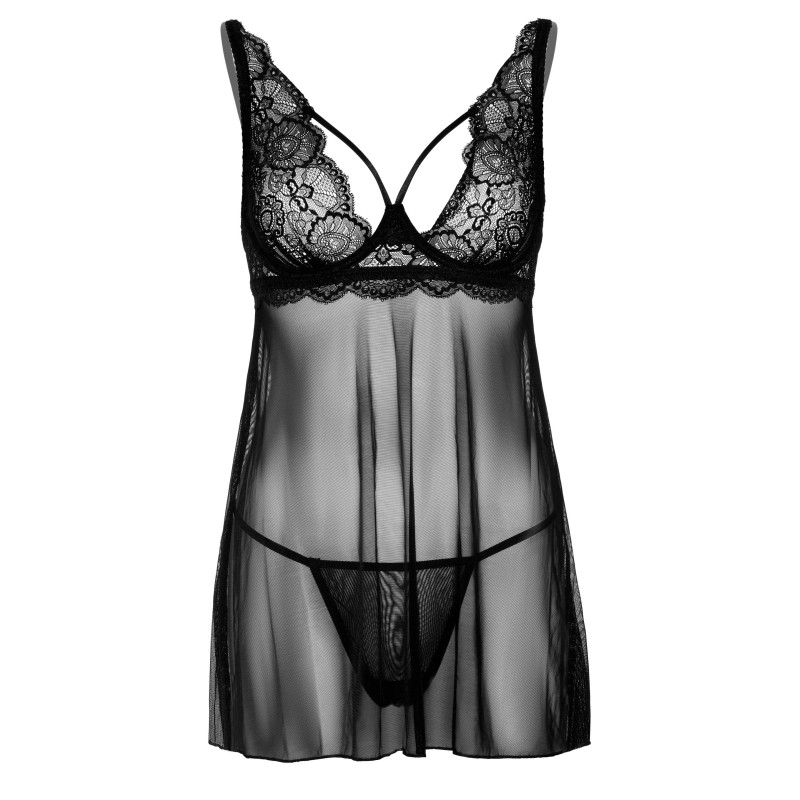 Babydoll in pizzo e perizoma - Babydoll sensuale in rete trasparente, coppe in pizzo con motivo a cuore e spalline per accentuare le tue curve. Ferretto con chiusura e spalline regolabili, cordino abbinato incluso.