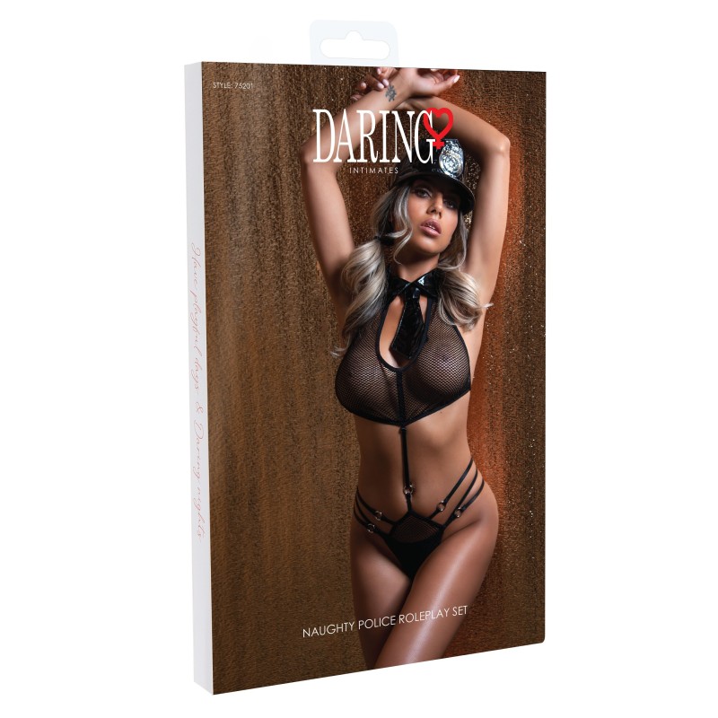 Set di giochi di ruolo Naughty Police - Set di giochi di ruolo Naughty Police, che include un perizoma trikini in sexy rete con colletto e cravatta effetto bagnato, anelli di metallo e spalline regolabili per una vestibilità ottimale. Berretto aperto abbinato effetto bagnato con badge incluso.
