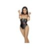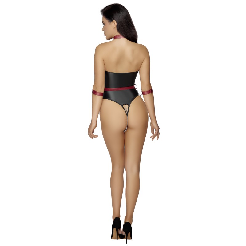 Corpo di stringa off-the-shoulder crotchless di Cottelli BONDAGE in un nobile look nero opaco. Viene fornito con un'imbracatura staccabile in look rosso opaco con accessori metallici color argento. Le catene a moschettone sono staccabili dall'imbracatura in modo che il collare, la cintura e le manette possano essere indossati anche da soli. Il collare e la cintura sono regolabili con bottoni a pressione, le manette con chiusure in velcro. Una catena stimolante passa attraverso il cavallo completamente aperto, che può anche essere rimosso.