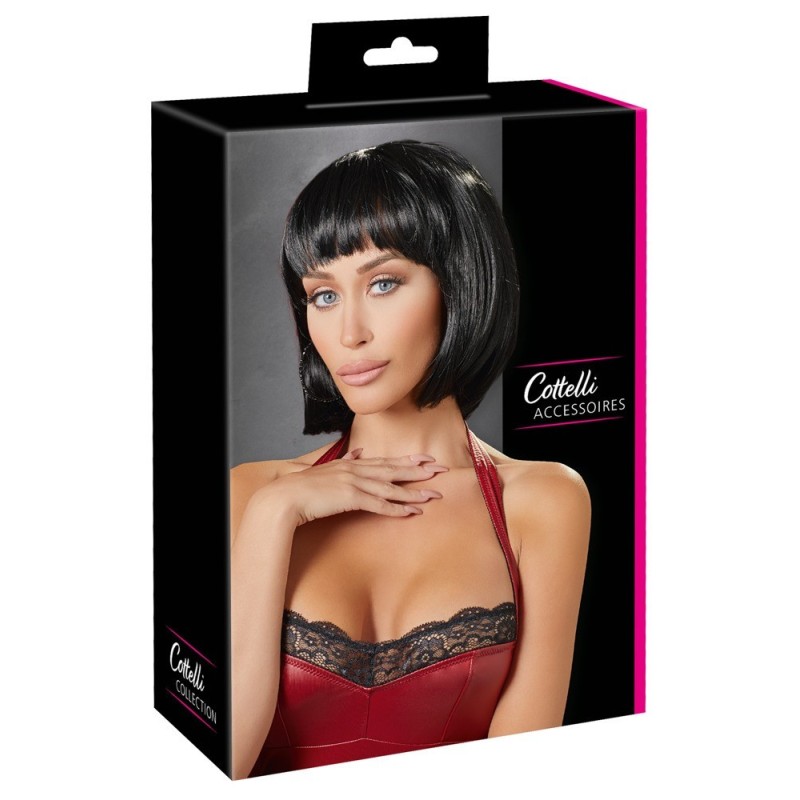 Parrucca nera di capelli corti di lunghezza pari al mento con frangia, per un emozionante cambio di tipo in pochi secondi. La frangia può essere accorciata se necessario. La parrucca è regolabile per una vestibilità senza scivolamenti. Nota: non adatta a ferri arricciacapelli e piastre - per la pulizia utilizzare uno shampoo speciale per parrucche.