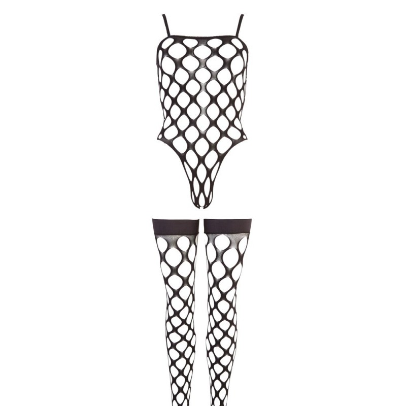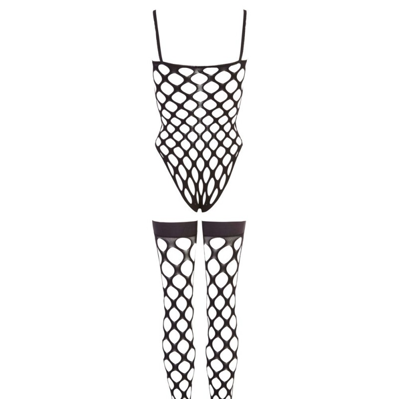 Corpo di Rio e calze in un set. Il tutto realizzato in rete nera, elastica, morbida e grossolana, senza cuciture. Calze di sostegno con rinforzo in silicone antiscivolo nella parte superiore. 90% poliammide, 10% elastan.