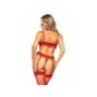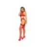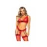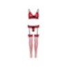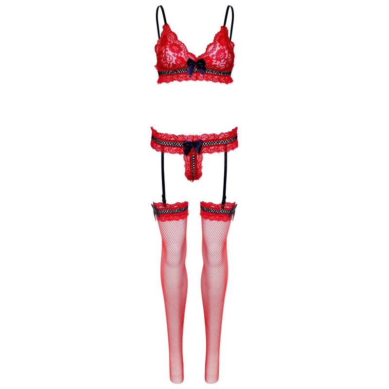 Set reggiseno e slip con balza in pizzo 3 pezzi con spalline regolabili, dettagli a rete e fiocco e calze a rete abbinate.