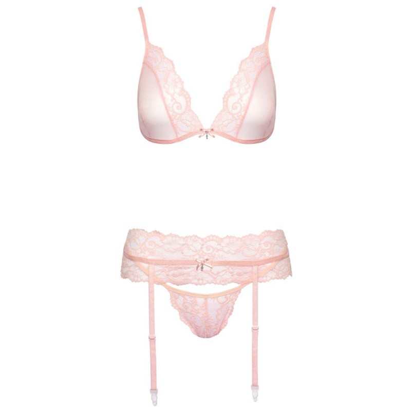 Uno stile esclusivo in un sensuale e delicato color rosa! Un set di reggiseno morbido, reggicalze e perizoma kissable in tulle fine e pizzo delicato. Morbido ed elasticizzato in ogni sua parte per il massimo comfort. Il reggiseno è dotato di spalline regolabili e chiusura a gancetto sulla schiena. Anche il reggicalze ha una chiusura a gancio sulla schiena e bretelle regolabili. L'intricato slip piccolo seduce con le sue due spalline elastiche che si uniscono all'inguine. 90% poliammide, 10% elastan. Consegna senza calze.
