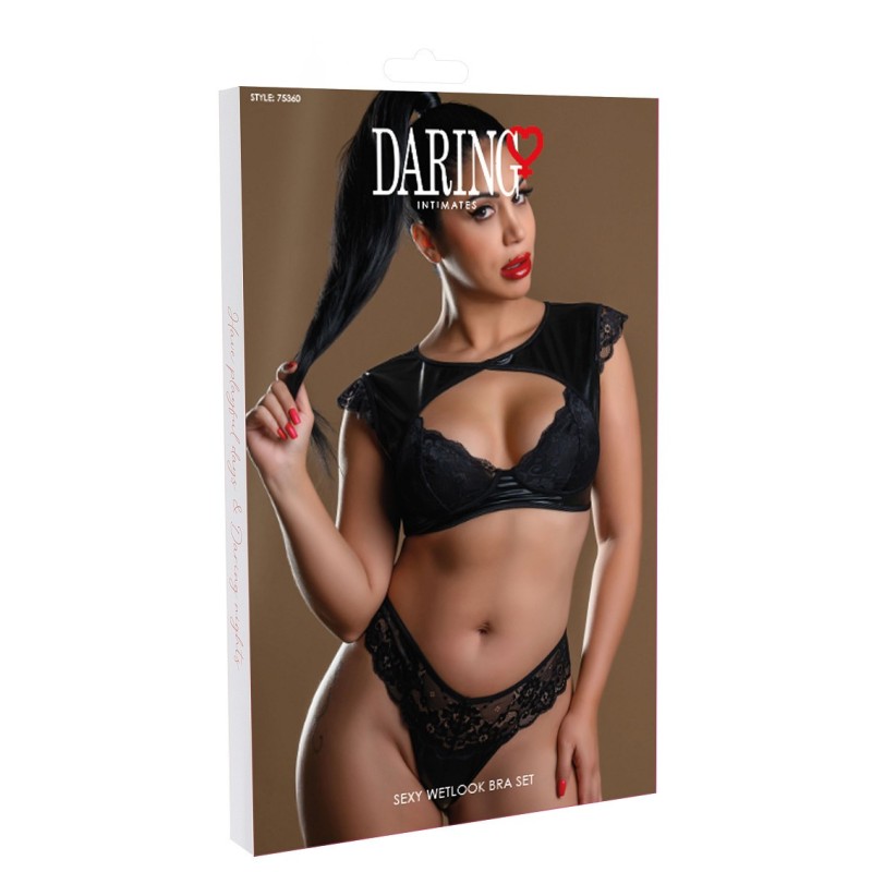 Scopri la seduzione con il set reggiseno 2 pezzi effetto wetlook di Daring Intimates, composto da un reggiseno elegante e uno slip coordinato. Realizzato in tessuto wetlook brillante e impreziosito da delicati dettagli in pizzo, questo set emana lusso e fascino. Perfetto per una serata di passione: indossalo come lingerie seducente o abbinalo a un blazer per un look audace. Lasciati guidare dai tuoi desideri e abbraccia il fascino irresistibile di questo raffinato set 2 pezzi.