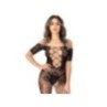 Diventa audace e sexy con questo bodystocking sexy con spalle scoperte. Il design completa le tue curve in pizzo delicato con dettagli incrociati sul davanti e sul retro, motivo a rose intrecciate e cavallo aperto. Gli slip non sono inclusi.