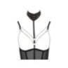 Elegante e invitantemente rivelatore! Body senza seno di Abierta Fina con cavallo completamente aperto in powernet con strisce di velluto elastico ed elementi di gioielleria color oro rosa. Cinghie e bretelle regolabili, bretelle anche rimovibili. Cinghia regolabile del décolleté con collana ornata di catene (con chiusura a bottone) anch'essa rimovibile, così come le catene del seno con piccoli moschettoni e la catena inguinale con anello decorativo. Tutte le catene sono inoltre decorate con piccoli strass. Vista posteriore in look a due pezzi con due chiusure a clip su reggiseno e mutandine/cintura in vita. 90% poliammide, 10% spandex. Senza calze.