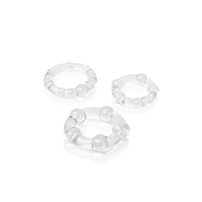 Gli anelli sono realizzati in TPR morbido, liscio e flessibile, trasparente e sono adornati con perle di piacere sensuali e noduli di stimolazione, per una maggiore sensibilità.