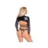 Stravagante set bondage nero di Bad Kitty composto da camicia senza busto e perizoma inguinale. Realizzato in morbida ecopelle elasticizzata con cinghie borchiate regolabili. Con un anello sul davanti del colletto e anelli laterali per i moschettoni di fissaggio all'interno delle maniche.
