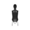 Stravagante body nero senza bretelle di Bad Kitty con maschera per la testa annessa. Realizzato in elegante ecopelle, morbida ed elastica per un elevato livello di comfort. Con una cerniera accuratamente integrata nella parte posteriore. Eccitante senza busto e invitantemente aperto all'inguine. Maschera per la testa con aperture per occhi e bocca. Le bretelle regolabili sono rimovibili.