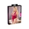 Velluto morbido e pizzo delicato! Body a cordoncino rosso dolce realizzato in velluto con parte superiore in pizzo, decorato in vita con nastri di velluto e anelli di strass dorati. Backless - Halter con chiusura a clip. Al passo con pratico bottone automatico per l'apertura.