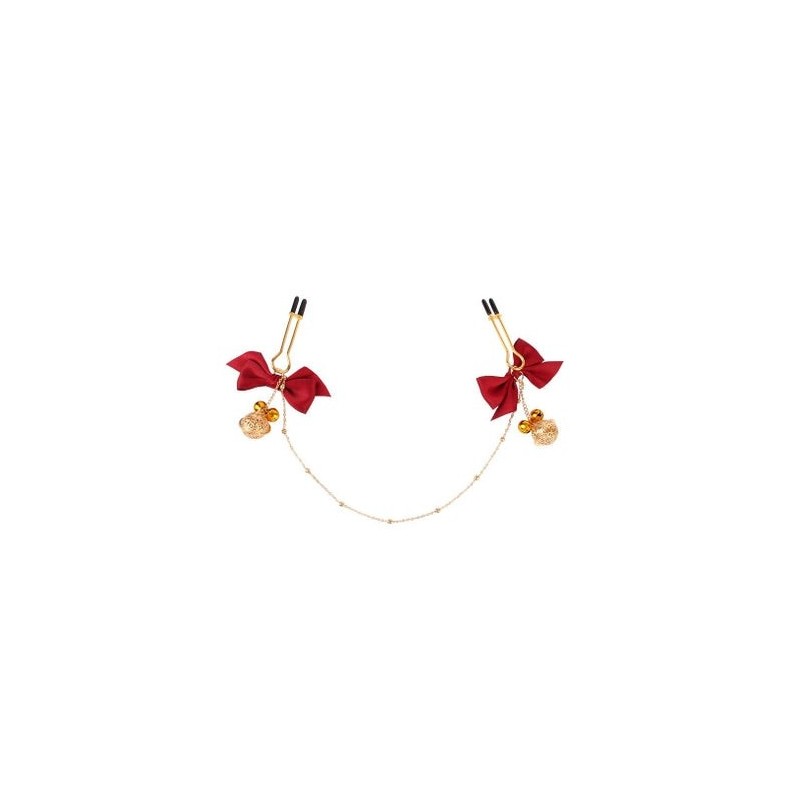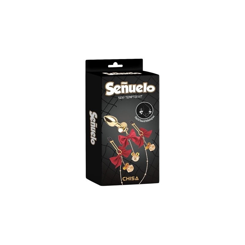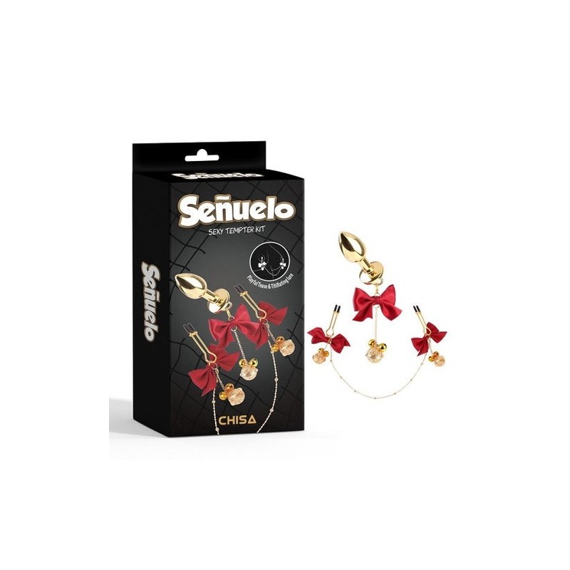 Il Chisa Sexy Temper Kit è set di accessori erotici progettati per amplificare il piacere e l'eccitazione durante i giochi erotici. Questo set offre una combinazione unica tra stimolazione dei capezzoli e anale, permettendo agli utenti di esplorare una varietà di sensazioni e di raggiungere nuovi livelli di soddisfazione. Il set contiene due morsetti per capezzoli regolabili e un plug anale, tutti decorati con graziosi fiocchi e catenelle con campanellini.