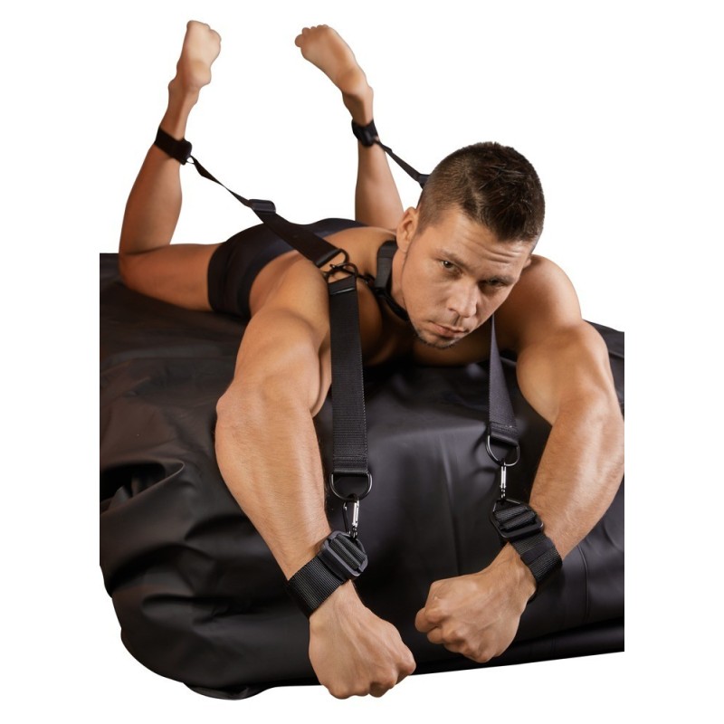 Set di trattenuta composto da una cintura per il collo (circonferenza massima 52 cm) con anelli a D sui lati e 4 cinghie in tessuto stabile (2 x 33 cm di lunghezza, 2 x 90 cm di lunghezza) con passanti alle caviglie alle estremità per mani e piedi, che possono essere regolati continuamente e con un moschettone lasciate allacciare. Tessuto: 100% poliestere, metallo.