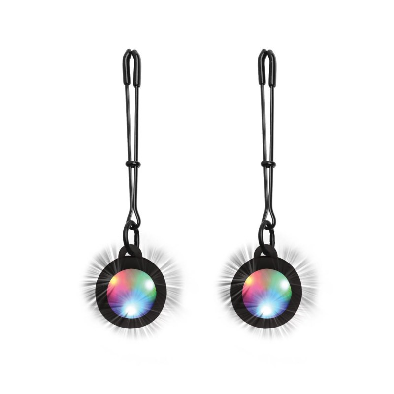 Distinguiti con questi esclusivi morsetti per capezzoli con luci a LED! I morsetti regolabili hanno un rivestimento in vinile e sono facili da attaccare al capezzolo. Facendo scorrere l'anello verso l'alto, si determina l'intensità desiderata. Scegli tra i 3 diversi schemi di luci premendo il centro della luce. Tieni premuto il centro un po' più a lungo e le luci si spengono. La luce funziona a batterie (incluse). Non è possibile sostituirle, ma sono disponibili luci di ricambio.