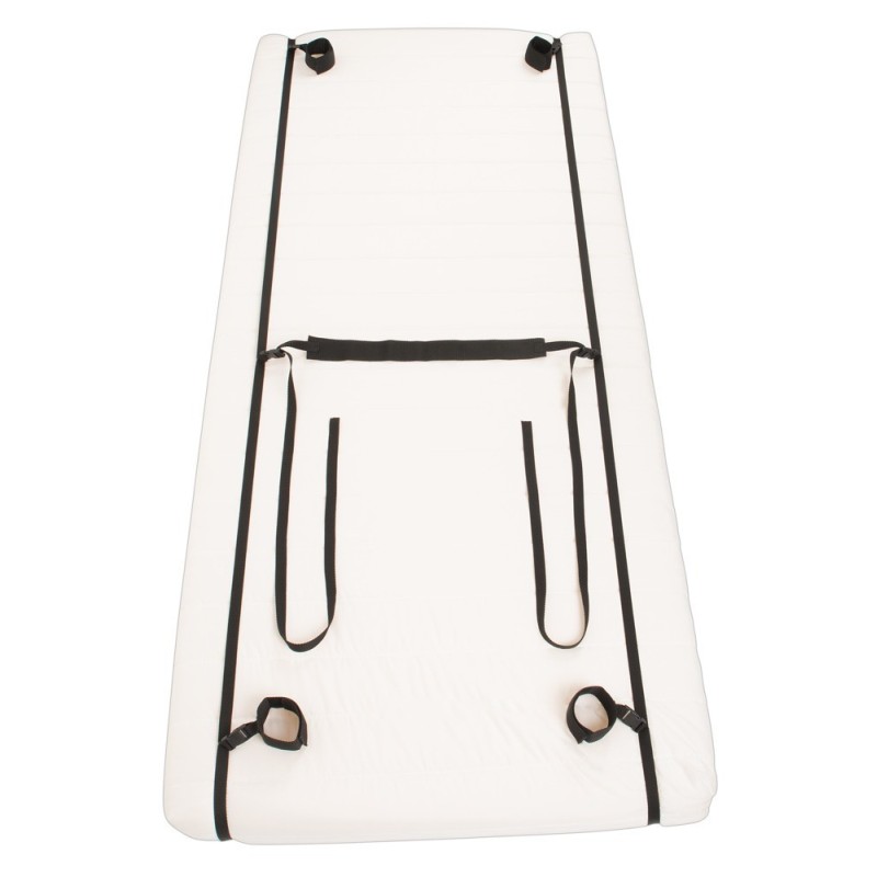 Cinghie da letto/porta ciascuna lunga 5,80 m (regolabile); cinghia in vita lunga 3 m (regolabile), rinforzata al centro lunga 50 cm; polsini di contenimento larghi 5 cm, lunghi 32 cm, regolabili con velcro. PP, PS.