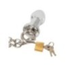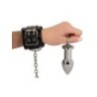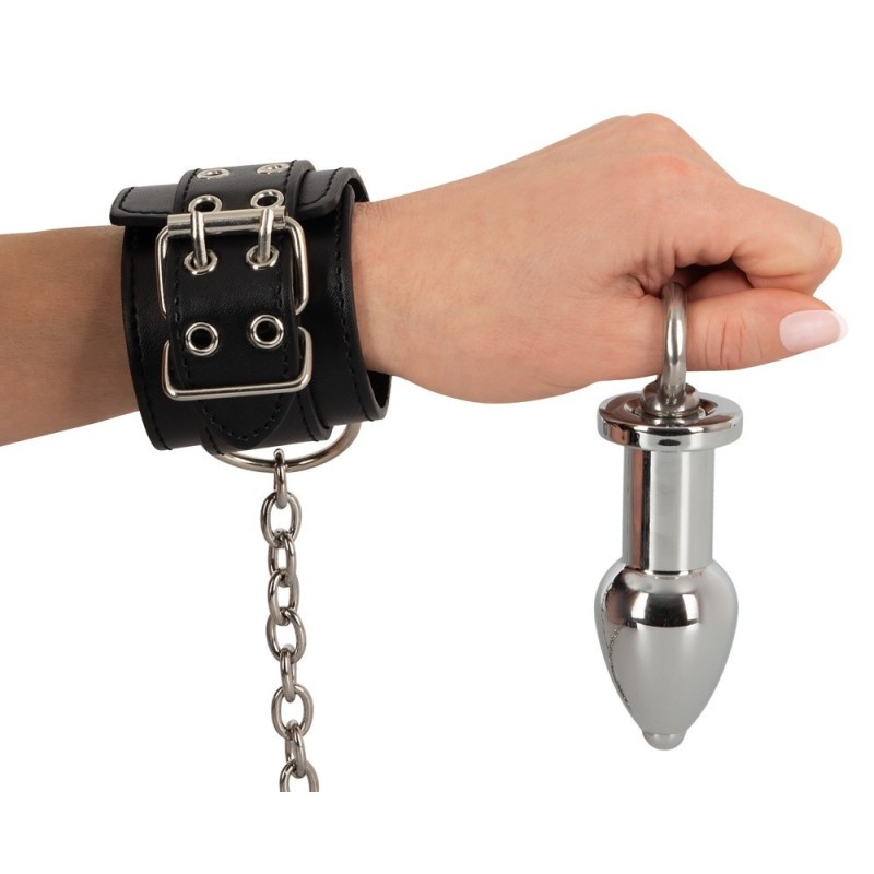 Eccitante combinazione di stimolazione anale e gioco bondage! Manette più plug anale da collezione fetish, collegati da catena e 3 serrature. Le manette in look elegante in pelle sono regolabili per LUI e per LEI tramite fibbie. Il tappo in acciaio inossidabile può anche essere riscaldato (in un bagno d'acqua) o raffreddato (in frigorifero) per il gioco caldo/freddo.