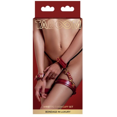 Stuzzica e soddisfa con il lussuoso, ed alla moda, TABOOM WRIST TO THIGH CUFFS SET e assicurati un po' di tempo esclusivo con il tuo partner. Aggancia i bracciali dei polsi, facili da usare e con clip solide, ai bracciali delle delle cosce per una vera limitazione. I bracciali sono resistenti, realizzati con materiali di alta qualità e perfetti per un'eccellente sessione BDSM. I bracciali sono anche fantastici da indossare come accessorio sexy. Preparati ad una lussuosa esperienza di bondage con questo Wrist to Thigh Cuffs Set in Pelle Vegana.