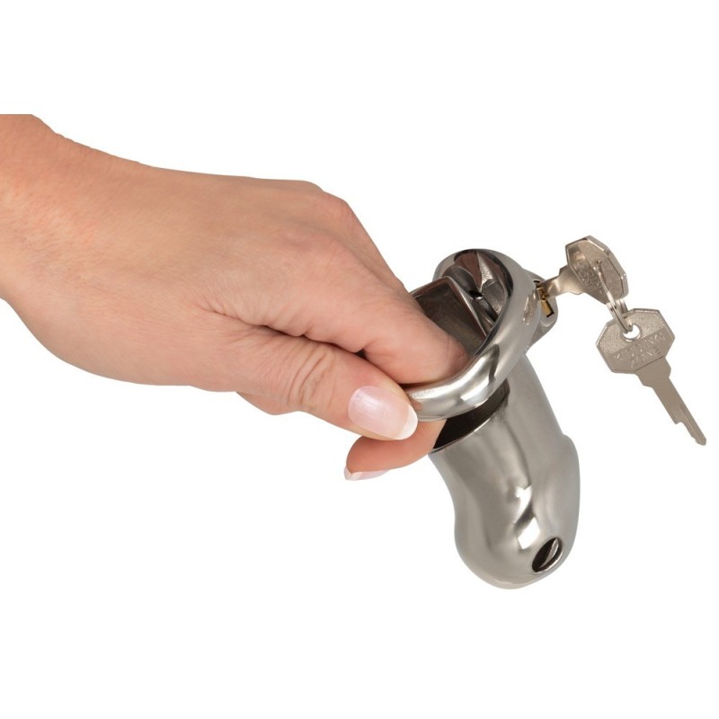 Naturalmente, la gabbia può essere bloccata con la serratura integrata (incl. 2 chiavi). Il glande della gabbia peniena chiusa è dotato di aperture in modo che il pene sia ben ventilato e chi lo indossa può ancora urinare e fare la doccia o il bagno senza problemi - perfetto per i giochi di educazione 24/7.