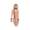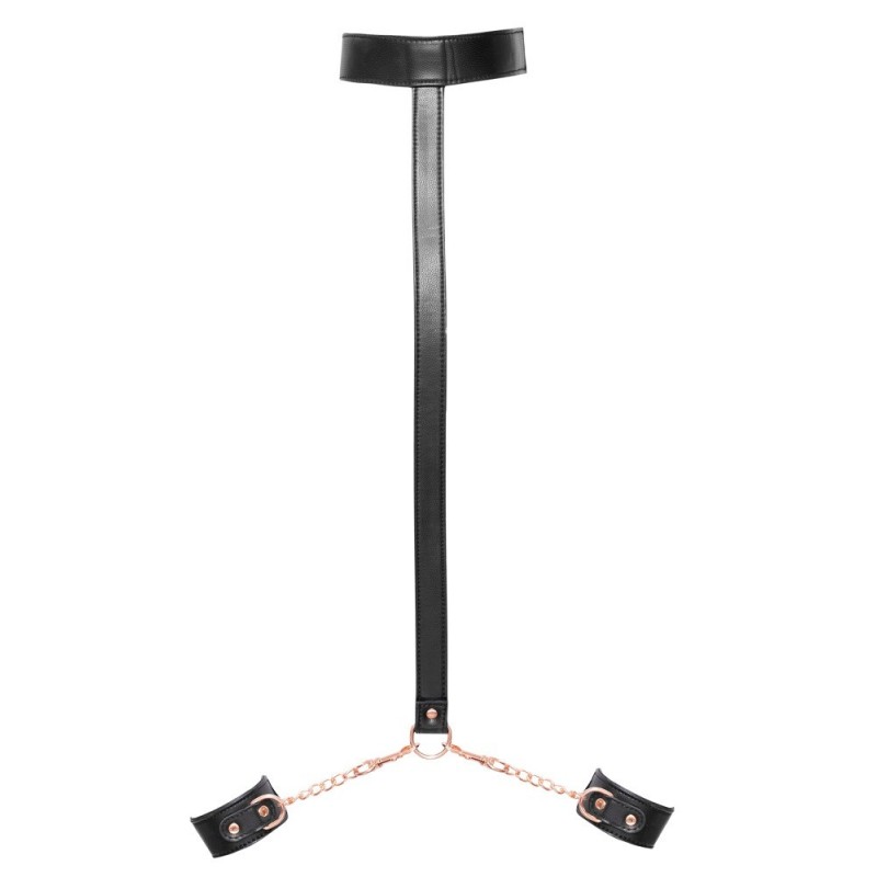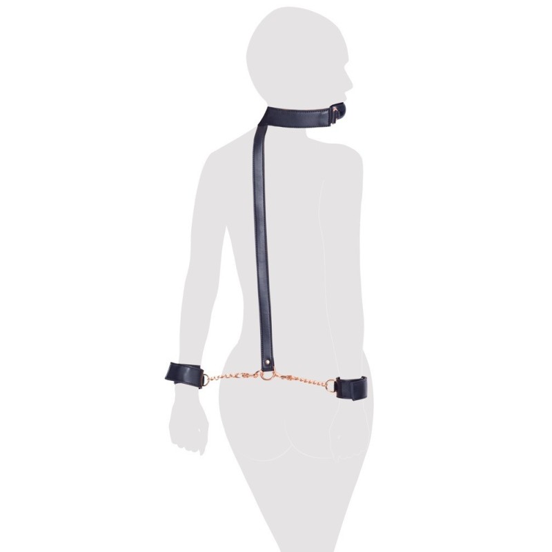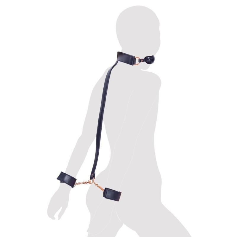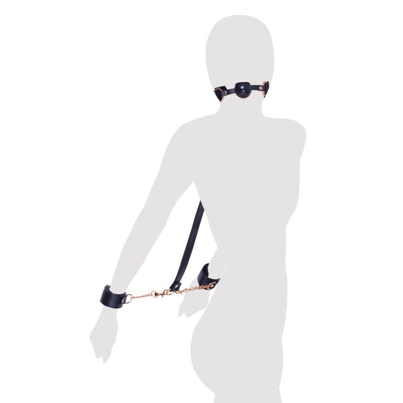 Combinazione bondage-bavaglio in un look di classe! Bavaglio con manette di Bad Kitty in elegante pelle con dettagli in metallo color oro rosa. La cinghia di collegamento per le manette è attaccata alla parte posteriore della cinghia della testa del bavaglio. Il bavaglio viene ripiegato e le mani sulla schiena vengono inabilitate. I comodi polsini e la cinghia per la testa del bavaglio si indossano rapidamente con chiusure in velcro e possono essere regolati per adattarsi. Manette con anello, catena corta e moschettone - staccabili dal cinturino di collegamento con anello. Bavaglio Ø 4 cm. Poliuretano (a base d'acqua), metallo. Bavaglio: silicone.
