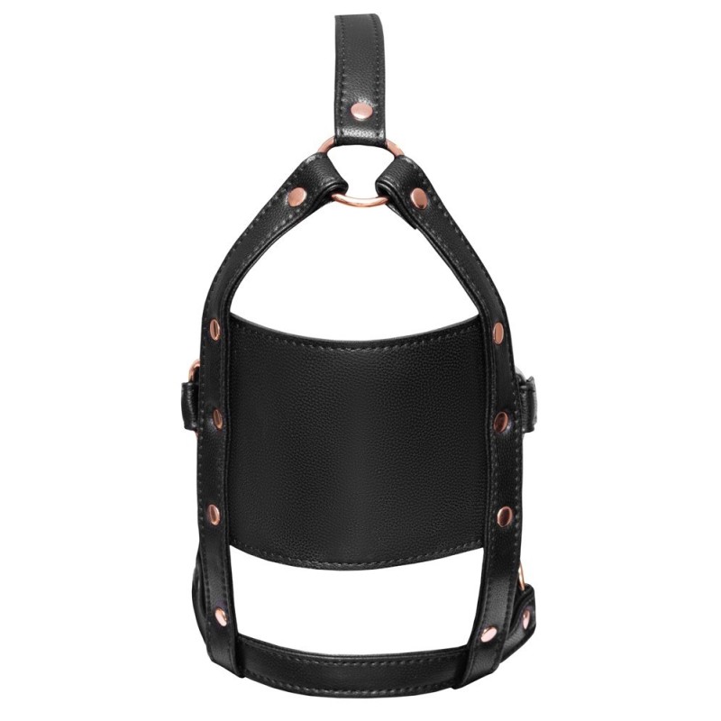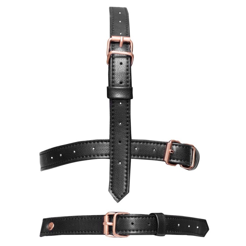 Nobile look bizzarro con comfort di utilizzo! Imbracatura per la testa di alta qualità di Bad Kitty con bavaglio rotondo a prova di morso (Ø 4 cm). In elegante pelle con dettagli in metallo color oro rosa. Regolazioni multiple con fibbie di chiusura per una vestibilità ottimale. Poliuretano (a base d'acqua), metallo. Bavaglio: silicone.