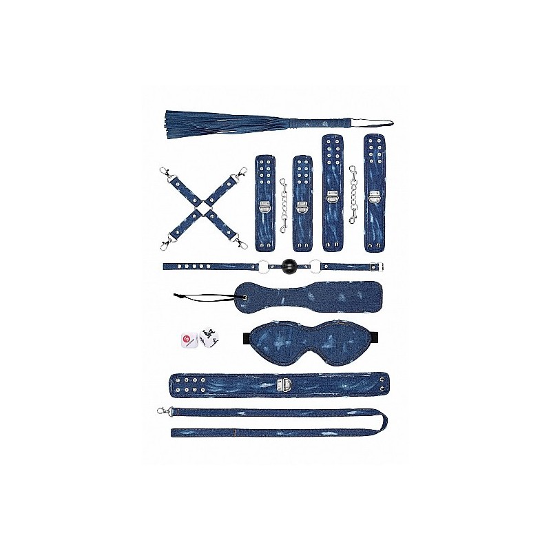 Il kit è composto da : manette da polso e da caviglia, mascherina per gli occhi, bavaglio a palla traspirante, collare con guinzaglio, paletta, flogger, pugnale e dadi.