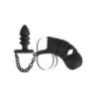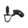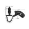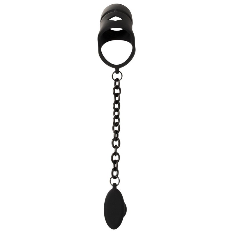 Il pene viene inserito nella gabbia in silicone flessibile, dalla forma anatomica ottimale, e l'anello elastico viene tirato sopra i testicoli in modo che il tutto si posiziona in modo antiscivolo. Il plug anale viene quindi inserito nell'ano. La catena di collegamento offre una trazione eccitante e sfrega in modo stimolante sul perineo quando viene indossata.
