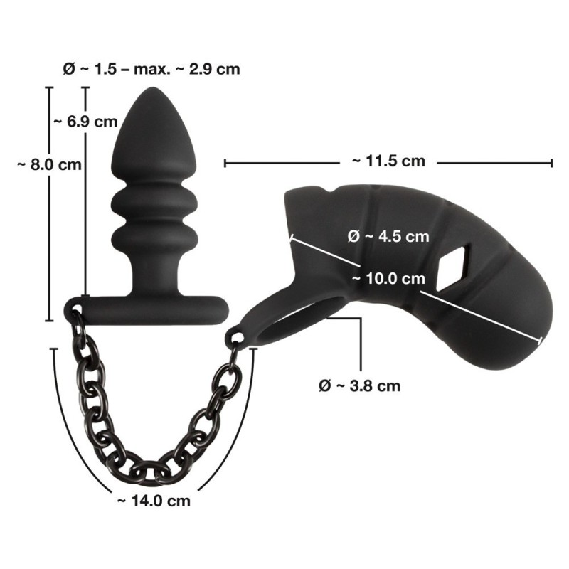La gabbia per il pene, l'anello per i testicoli e il plug anale sono realizzati in silicone delicato al tatto e si adattano perfettamente all'anatomia e ai movimenti. Proprio come la robusta catena di collegamento in metallo, saldamente bloccata. In questo modo si garantisce anche la sicurezza anale, in modo che il tappo non scivoli all'interno. Ciò significa che l'imbracatura eccitante può essere indossata anche in modo permanente. Le fessure di ventilazione nella gabbia flessibile del pene e l'apertura per la minzione sul glande assicurano un ulteriore piacere di utilizzo.