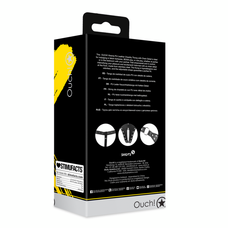 Questo perizoma di castità in pelle PU OUCH! Xtreme PU Leather Chastity Thong con dettaglio a catena è ideale per abbandonarsi a fantasie fetish, giochi BDSM o di ruolo, sia alle feste che in camera da letto con il partner. Sentitevi padrone e in controllo, intensificando il vostro piacere e la vostra eccitazione! Adornato con un dettaglio a catena sul davanti, realizzato in acciaio inossidabile. Il perizoma è ipoallergenico e inodore e le cinghie regolabili garantiscono una vestibilità perfetta.