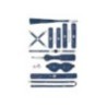 Il kit è composto da : manette da polso e da caviglia, mascherina per gli occhi, bavaglio a palla traspirante, collare con guinzaglio, paletta, flogger, pugnale e dadi.