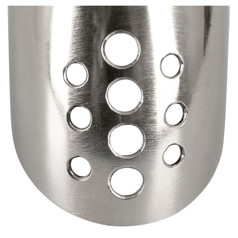 Lunghezza totale 13,5 cm, lunghezza della gabbia 12 cm, Ø 3,5 cm. Anello del testicolo Ø 4,4 cm. Peso 193 g. Metallo.
