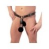 Imbracatura in pelle nera composto di cinghie multiple con fibbie facilmente regolabili composto da tre anelli (cm. 5 - 4,5 - 4) in metallo per pene di cui uno per i testicoli (la pelle che si aggancia nell'anello per i testicoli riduce il diametro di qualche millimetro) e dildo anale nero in lattice completamente fissato. Si consiglia l'utilizzo di un buon lubrificante anale a base d'acqua