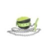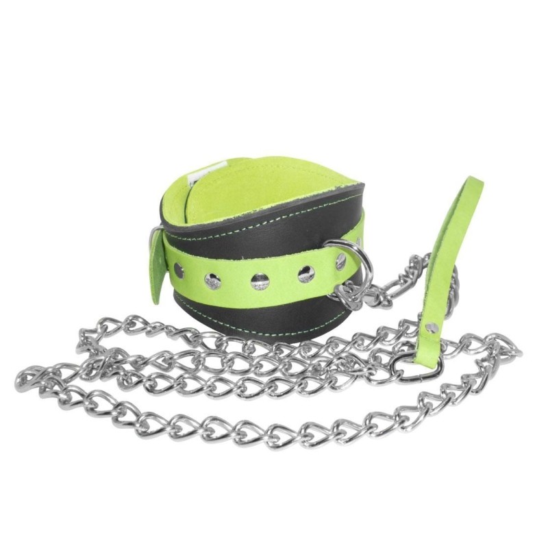 Collare in vera pelle (con interno scamosciato per un maggior comfort), guinzaglio con catena ritorta in ferro nichelato e laccio/polsino sempre in pelle. Prodotto artigianale 100% Made in Italy.