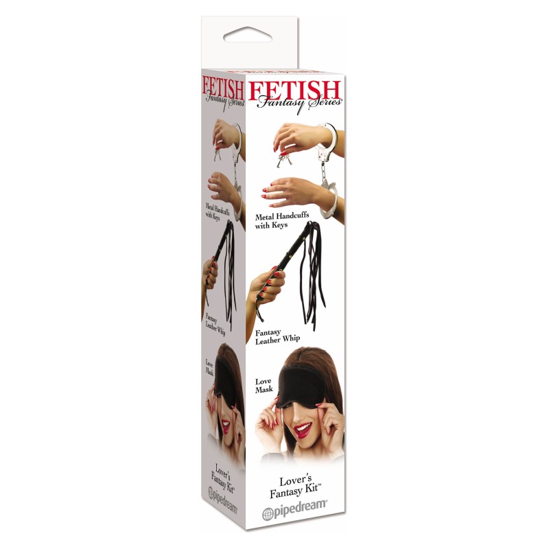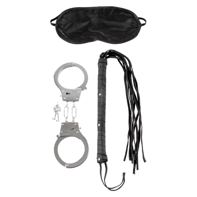 Un kit completo per dare un tocco di piccante stravaganza ed eccitante trasgressione alle Vostre sexy avventure! Manette in metallo argenteo con chiavi in dotazione, frustino in pelle con frange e, per completare il tutto, mascherina copri occhi in elegante tessuto nero satin... Un'arma di seduzione a dir poco vincente!