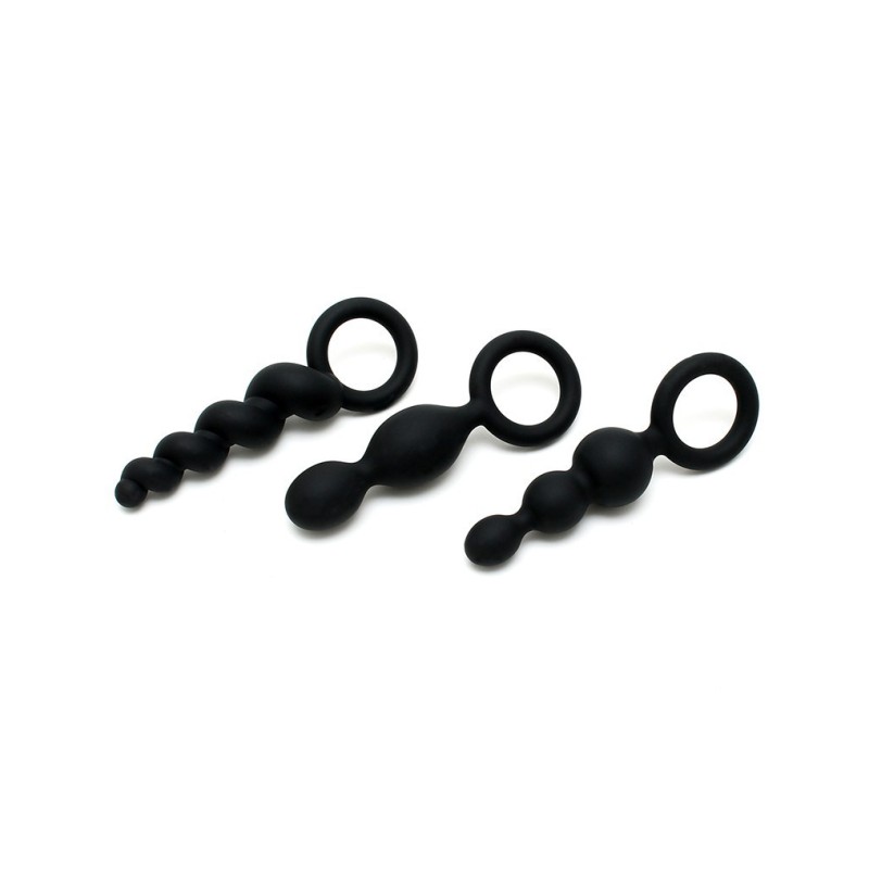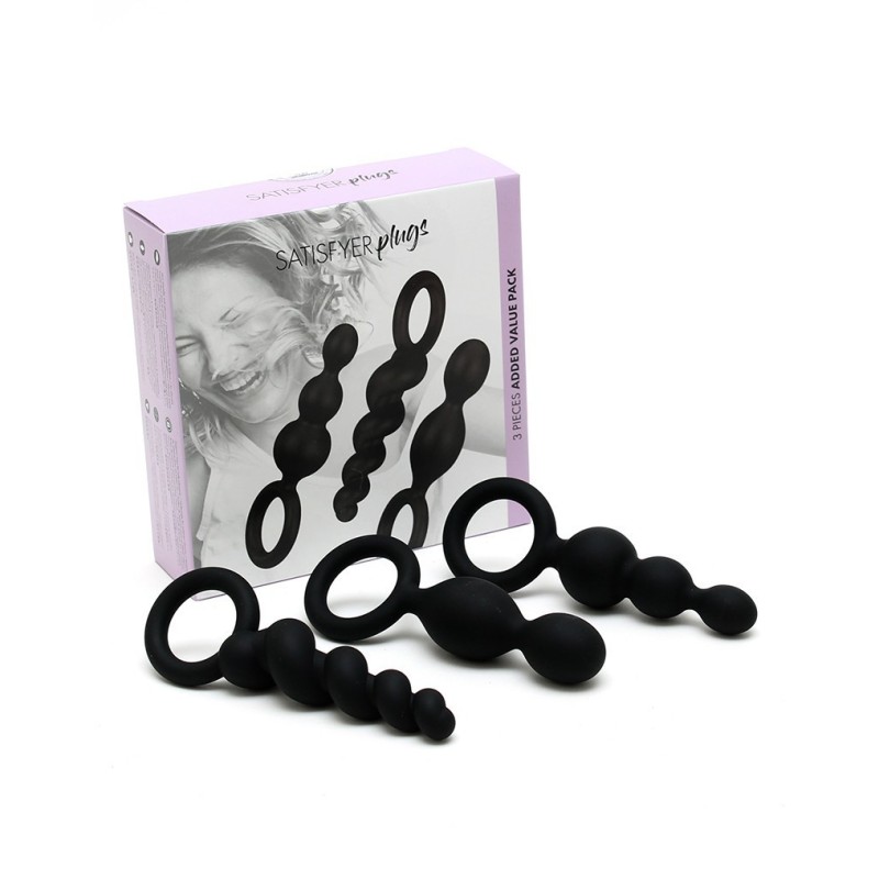 Un set di 3 splendidi plug anali in silicone di diverse forme di Satisfyer, tutti e 3 con impugnatura ad anello e con diametro crescente. La qualità del silicone e la varietà delle forme farà di questo prodotto il vostro piccolo arsenale del piacere. A Cosa serve? I plug sono stimolatori anali adatti sia a lui che a lei, da usare singolarmente o nel contesto di un rapporto sessuale, per rendere più proficuo e piacevole l’amplesso. L'elegante forma affusolata ed il pregiato silicone (il materiale ipoallergenico più apprezzato nel campo dei sex toys) rendono questi prodotti Satisfyer tra i migliori nel loro campo. Come si usa? Inserite manualmente il plug nel vostro ano o in quello del vostro partner, preferibilmente dopo abbondante lubrificazione con lubrificante a base acquosa. Dopo l'uso il silicone è facilmente lavabile con acqua calda e prodotti specifici per sex toys.