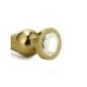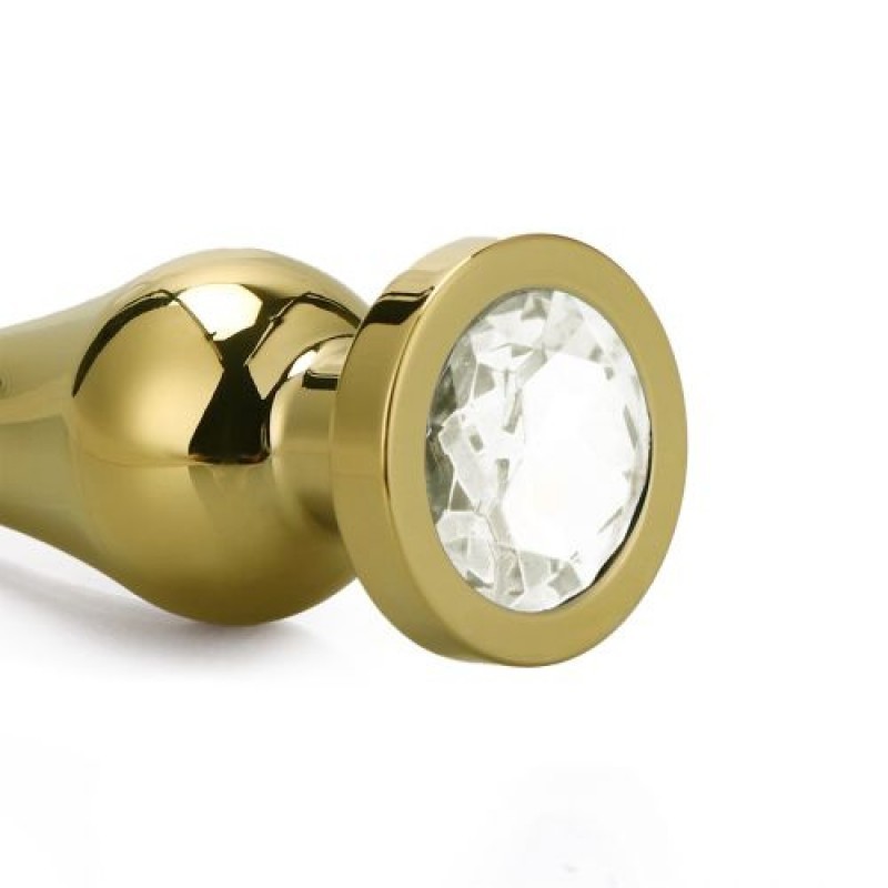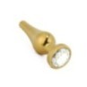 Plug anale in alluminio laccato oro con un gioiello incastonato alla base. Punta affusolata per un graduale inserimento, facile presa e maneggevolezza. Totalmente liscio e con originale forma conica, dal diametro crescente.