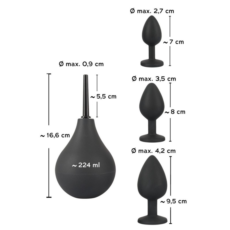 Trio doccia e plug per il piacere anale! 4 giocattoli di alta qualità in una sola scatola: 1 doccia anale per la pulizia preparatoria e meravigliose sensazioni di squirting. Altezza 16,6 cm, lunghezza di inserimento 5,5 cm, ugello della siringa Ø 0,7 a 0,9 cm, capacità di riempimento 224 ml. 3 x plug anali di diverse dimensioni per un perfetto allenamento stretch e ognuno con gemma alla base per un look eccitante nella stanza posteriore. Dimensioni: Spina Piccola lunghezza totale 7 cm, lunghezza d'inserimento 6 cm, Ø max. 2,7 cm, 25 g di peso. Spina Media Lunghezza totale 8 cm, lunghezza d'inserimento 7 cm, Ø max. 3,5 cm, peso 44 g. Spina Large Lunghezza totale 9,5 cm, lunghezza d'inserimento 8,5 cm, Ø max. 4,2 cm, peso 75 g. Silicone, PU, ABS, acrilico.