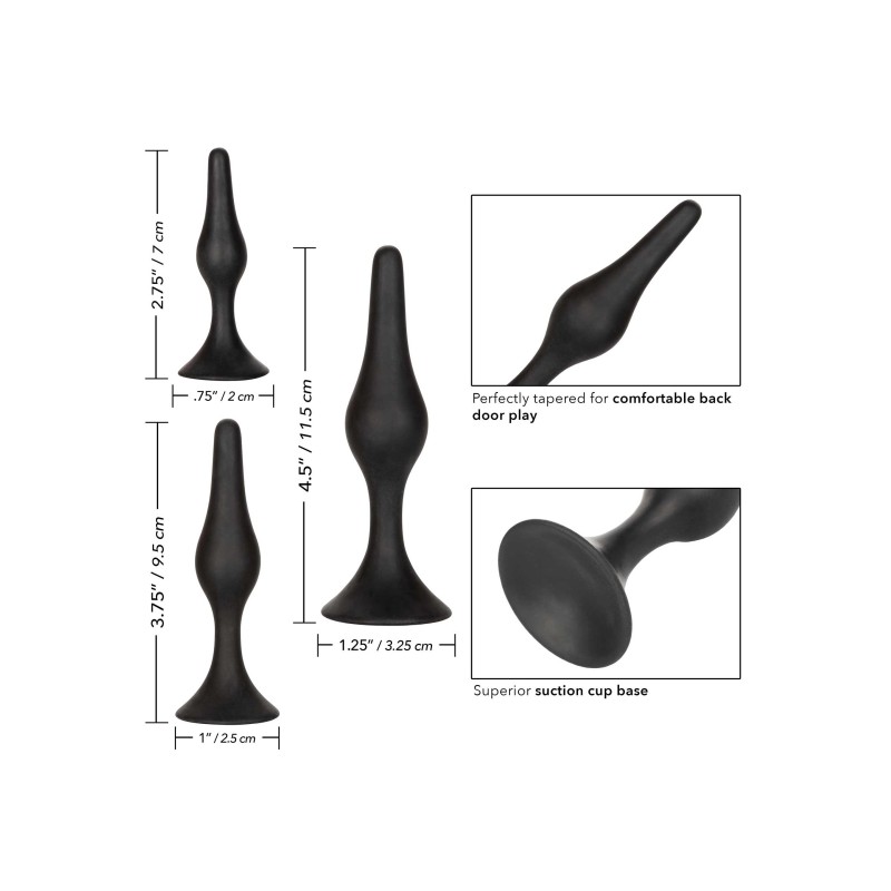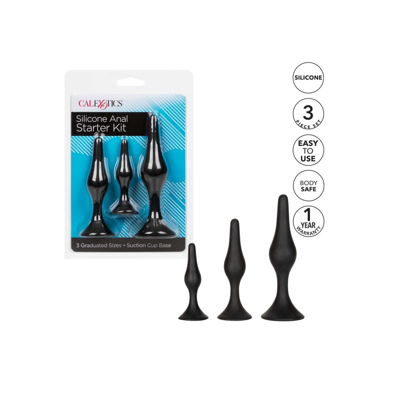 Lasciatevi trasportare in un'eccitante sensazione anale con il Silicone Anal Starter Kit. Questo kit birichino include un set di 3 plugs anali graduati e affusolati per permetterti di aumentare in modo sicuro e confortevole la stimolazione anale appassionata. Per godere di tutto ciò che l'esaltante mondo del gioco anale ha da offrire, l'allenamento è necessario per garantire la totale sicurezza e soddisfazione. Ogni sonda nel nostro kit aumenta gradualmente in lunghezza e circonferenza per un piacere superbo a qualsiasi livello di gioco di piacere.Mentre ogni aumento del tuo allenamento espande i tuoi orizzonti, usa la comoda base flangiata per una stimolazione vaporosa, un inserimento senza sforzo e una rimozione delicata. Le sonde flessibili sono fatte di un silicone Satin Finish™ liscio e senza cuciture. Questo materiale sicuro per il corpo è senza profumo e senza ftalati per mantenere i tuoi punti più sensibili felici e sani.